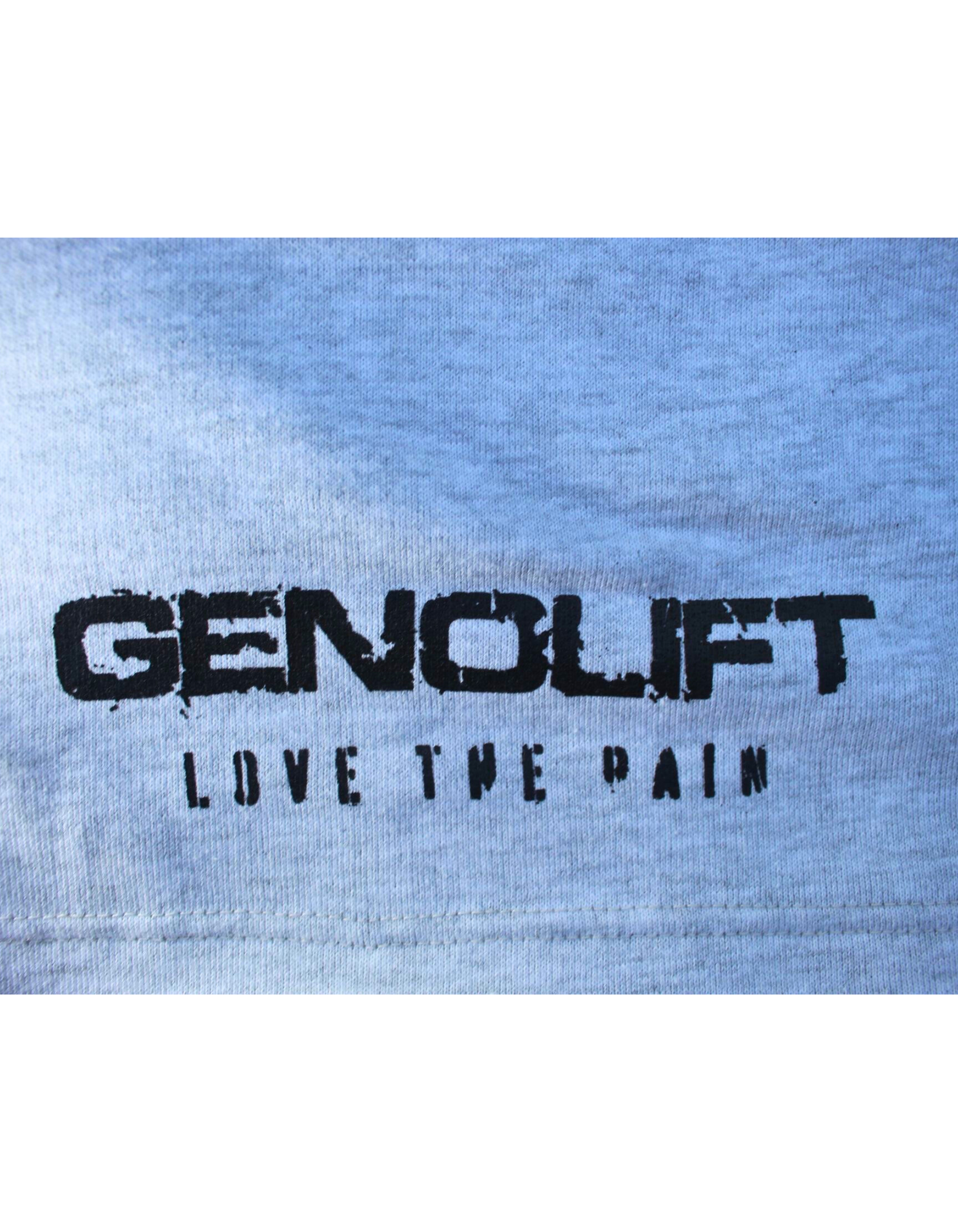 Pantaloncino oversize 100% cotone non garzato, color grigio mélange con grafiche nere in contrasto; lunghezza al ginocchio con taglio vivo ed elastico già presente internamente.